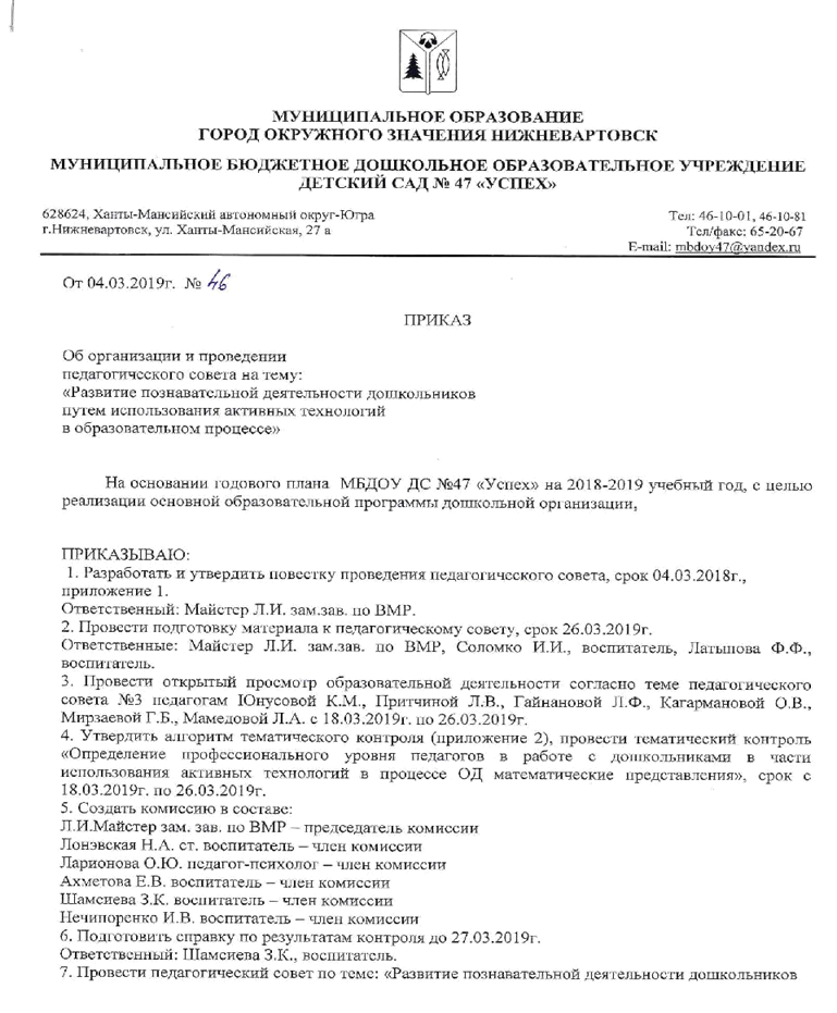 Об организации и проведении педагогического совета на тему "Развитие познавательной деятельности дошкольников путем использования активных технологий в образовательном процессе", от 04.03.2019 г., № 46